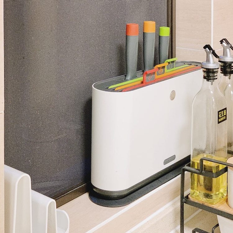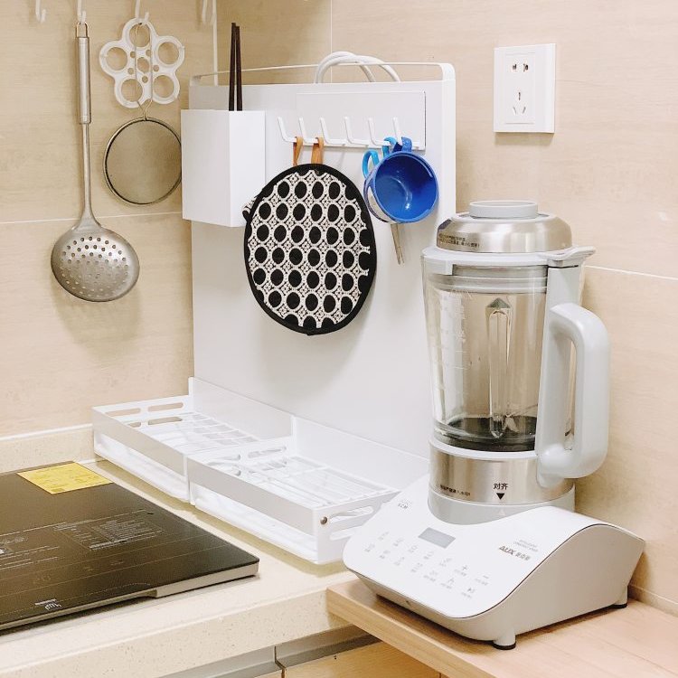 Un espace de 20 cm à côté du lave-vaisselle mural a été transformé en une grille de stockage magnétique, avec un draineur de vaisselle en dessous et un draineur d'ustensile avec des crochets au-dessus, ce qui le rend pratique pour les plats de séchage. Le rebord de la fenêtre accueille parfaitement un stérilisateur de couteau et un support de couvercle en pot.