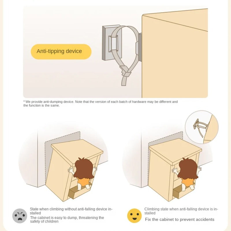 Pour prioriser la sécurité des enfants, cette armoire inclut un dispositif anti-basculement pour ancrer fermement le meuble, prévenant ainsi les accidents potentiels lors de l'utilisation. Elle est également dotée d'une poignée ronde en bois massif pour une prise confortable et un fonctionnement silencieux et fluide, idéal pour les mains des enfants.