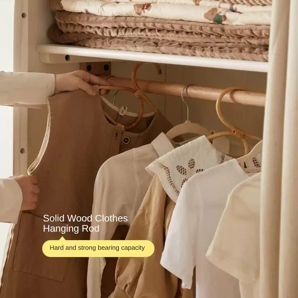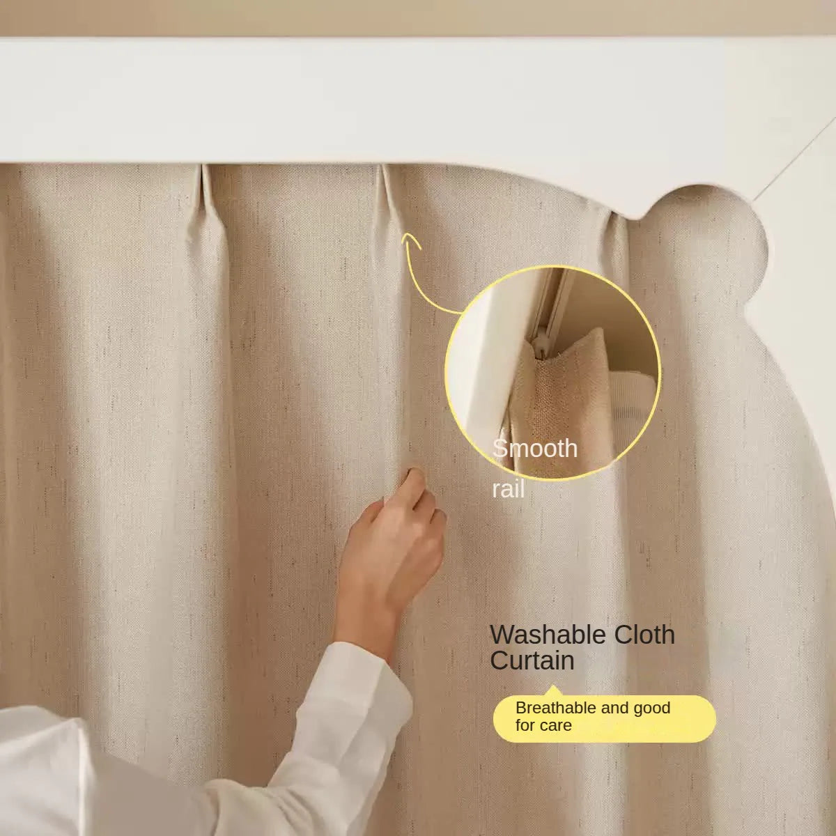 Des détails importants tels que les coins arrondis garantissent la sécurité, tandis que la construction en bois massif offre une tranquillité d'esprit, permettant aux enfants de grandir et d'apprendre dans un environnement sûr. Le rideau en tissu amovible et lavable permet de maintenir la propreté sans compromettre l'espace, créant un environnement respirable idéal pour les vêtements des enfants.