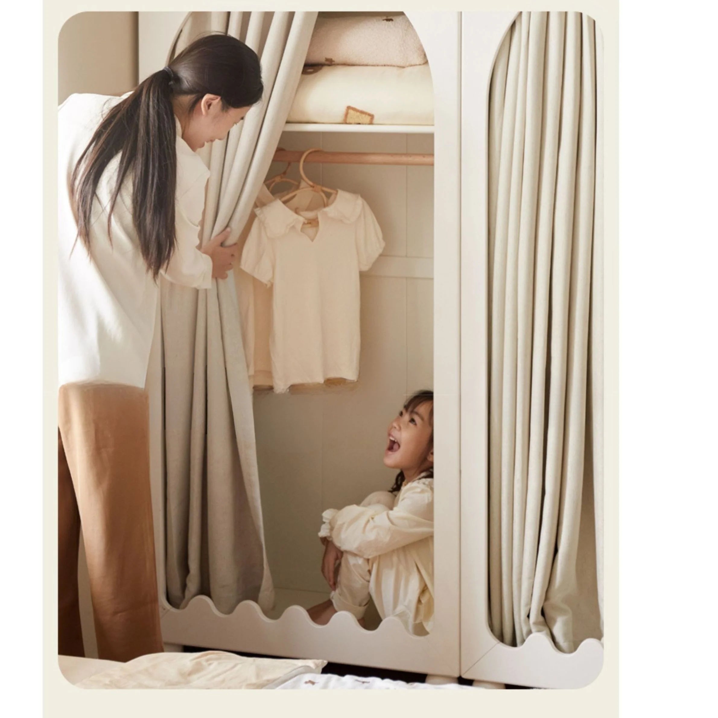 L'armoire présente un design unique de porte à rideau qui est à la fois attrayant et fonctionnel, facilitant l'ouverture pour les petites mains curieuses. Le rideau dissimule astucieusement les affaires de votre enfant, transformant l'armoire en un espace enchanteur qui stimule la créativité et l'imagination.