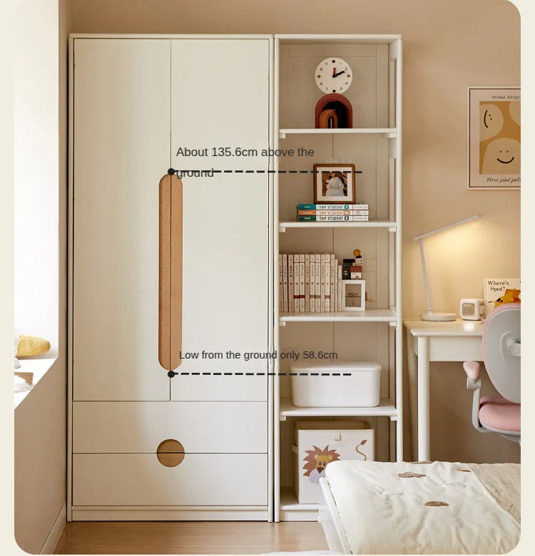 Cette armoire atteint une hauteur impressionnante d'environ 135,6 cm au-dessus du sol et seulement 58,6 cm à son point le plus bas, ce qui la rend idéale pour que les enfants accèdent facilement à leurs affaires.