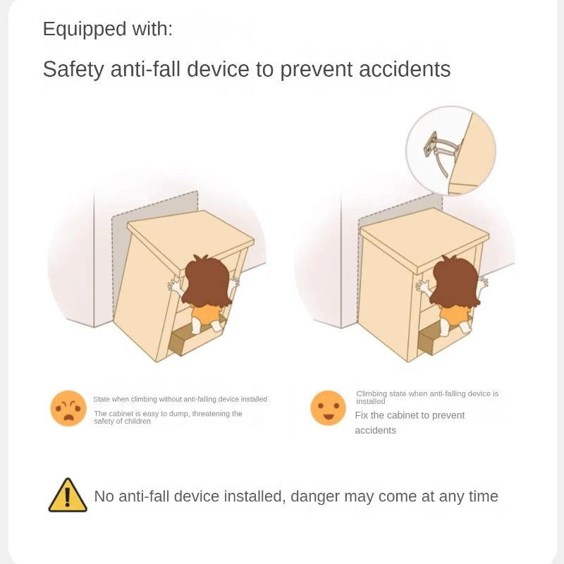 お子様の安全が私たちの優先事項です。このワードローブは転落防止ハードウェアと安定した構造を備えており事故を防ぎます。使用中の安定性を確保するために、ワードローブを壁に固定することをお勧めします。各ワードローブには安心して空間を探索できるように、安全転落防止装置が含まれています。