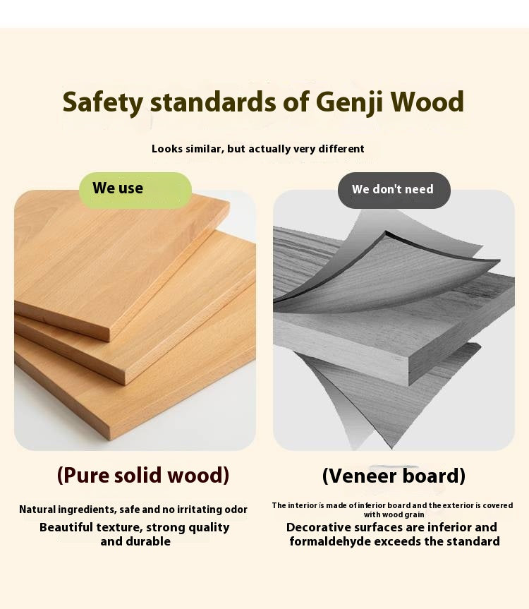 This kids' learning desk is crafted from 100% solid European beech wood, prized for its fine grain, warm color, and exceptional durability. The construction incorporates New Zealand pine for the frame and leg pads, providing enhanced strength and stability. Additionally, Paulownia wood is utilized in certain components to ensure resistance against wear and deformation, allowing for long-lasting use.