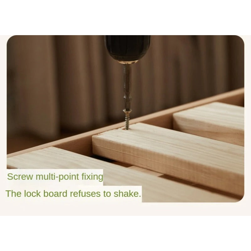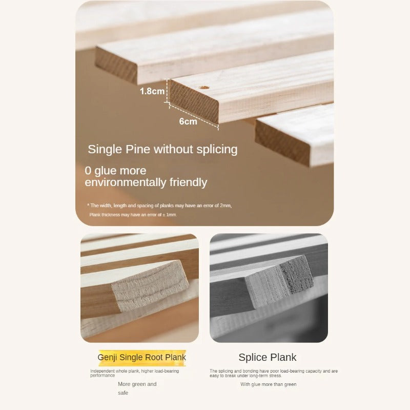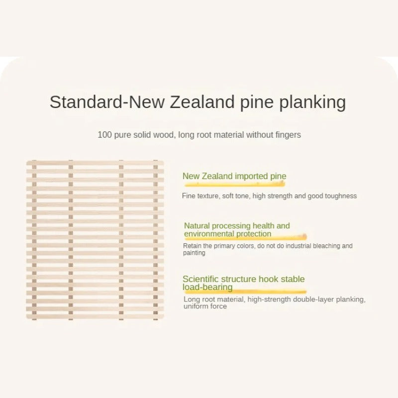 Enhancing the bed's support and stability, the auxiliary material is high-quality New Zealand pine, renowned for its toughness, stability, and minimal knots. This pine wood is used strategically for bed support, planks, and middle sections, delivering reliable performance for years to come.