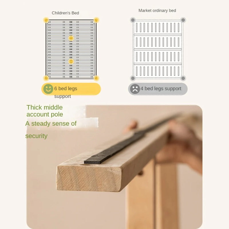The Beech Solid Wood Children's Modern Soft Bed is engineered with safety and stability at its core. Equipped with six evenly distributed bed legs, this design firmly supports the bed, preventing any risk of rollover. Each leg has a thickness of 8 cm, ensuring robust load-bearing capacity.