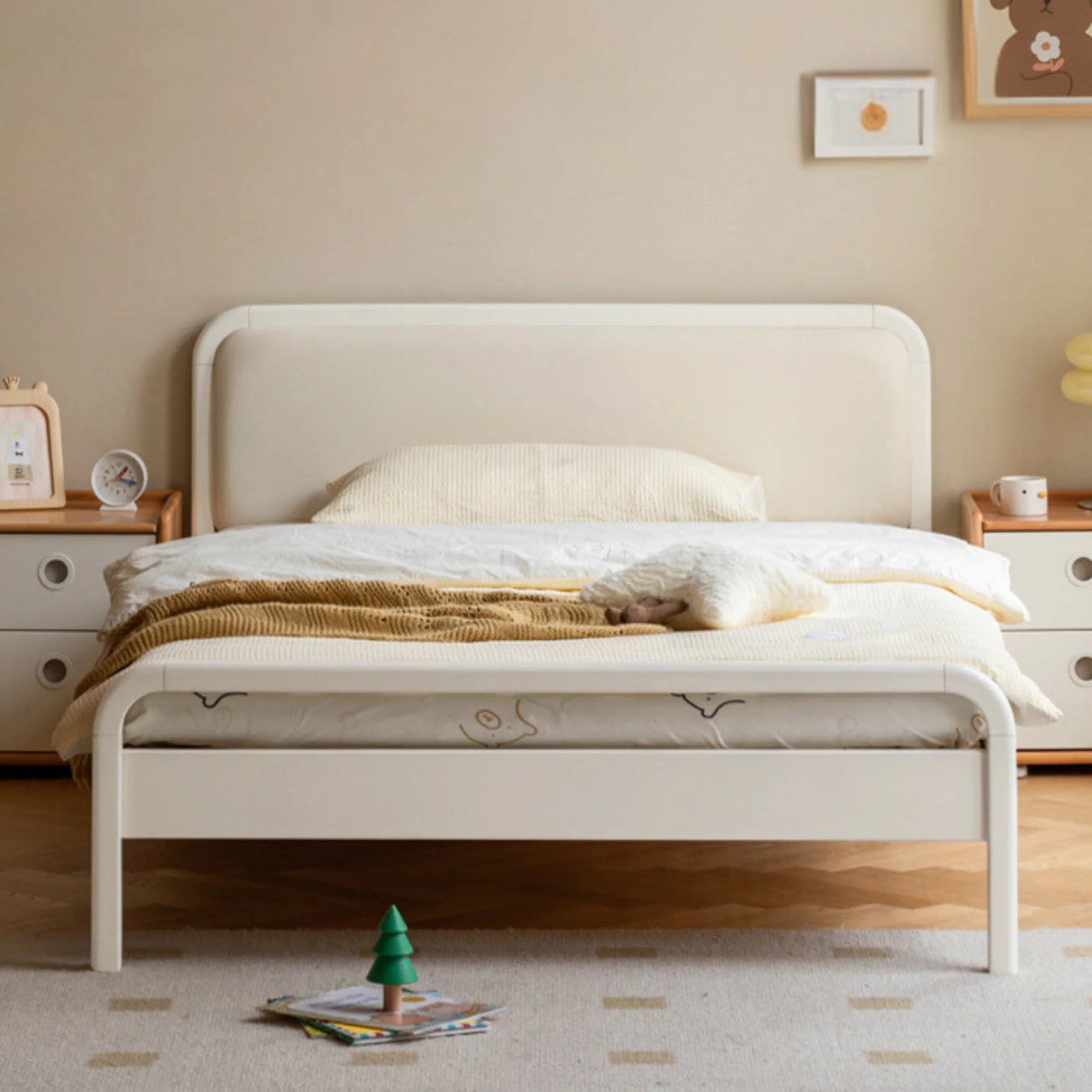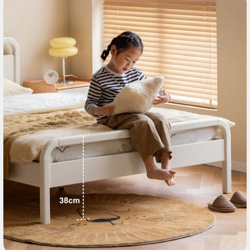 The bed is designed to bring a gentle and inviting atmosphere into the room, available in a lovely cream milk tea color that adds brightness to the space. The head and tail of the bed feature large rounded corners, making it not only a stylish choice but also a safer option for children.
