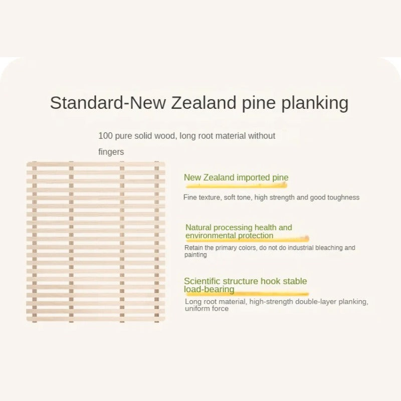 The auxiliary materials include New Zealand pine, which is utilized in key structural components such as the middle support pole, support legs, and planking supports. New Zealand pine is praised for its excellent toughness, light weight, and minimal knots, adding to the overall robustness of the bed.